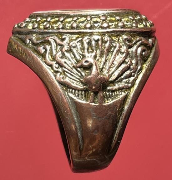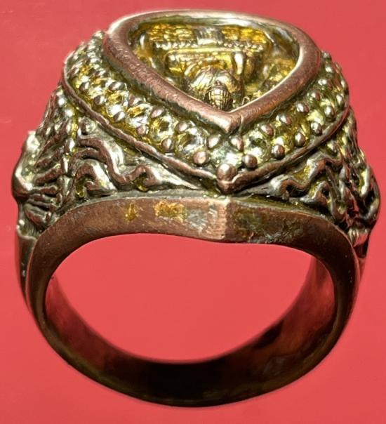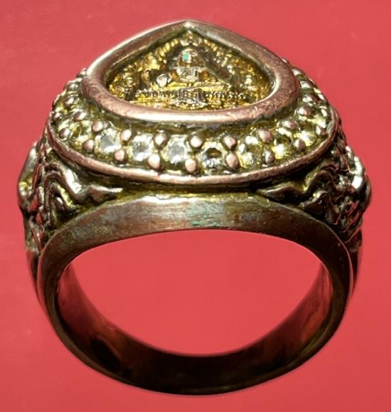 แหวนเนื้อ 3 กษัตริย์ งานช่างแกะสั่งทำ หัวแหวนติดเหรียญหล่อรูปหยดน้ำ หลวงพ่อวัดไร่ขิง นครปฐม ปี2543 เนื้อ 3 กษัตริย์ฝังพลอยรอบวง ขนาดนิ้วผู้ชาย |