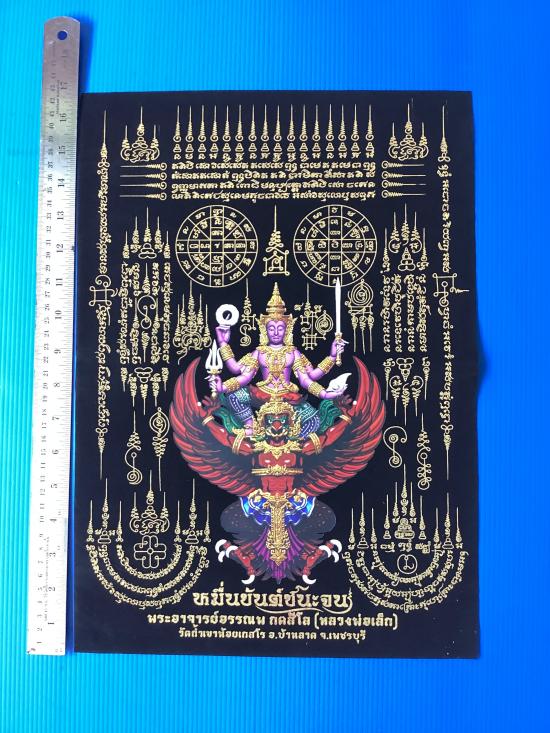 ผ้ายันต์ พระนารายณ์ทรงสุบรรณ หมื่นยันต์ชนะจน พระอาจารย์อรรณพ(อาจารย์เล็ก) วัดถ้ำเขาน้อย จ.เพชรบุรี ผ้ากำมะหยี่สีดำ ขนาด A3 (11.5 นิ้วx 16.6 นิ้ว) |