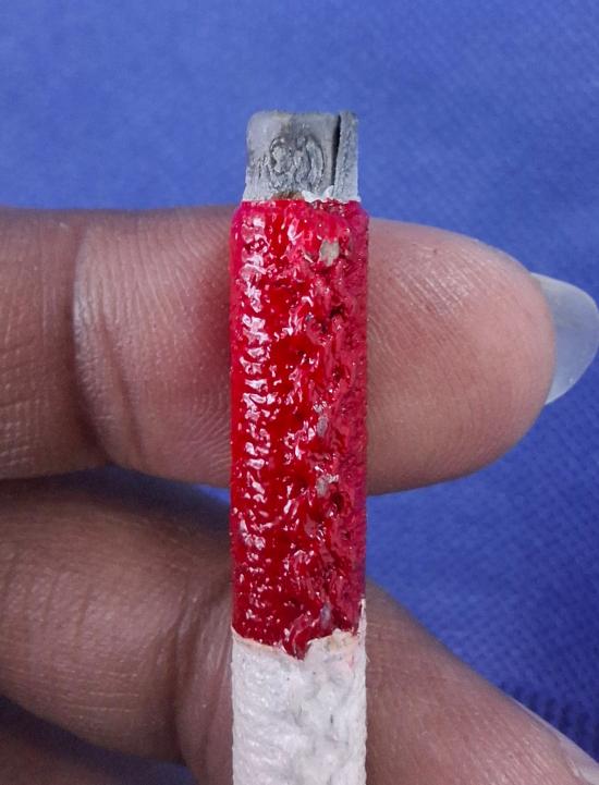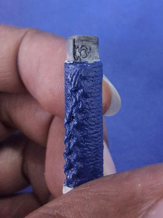 หลวงปู่ขุ้ย วัดซับตะเคียน ตะกรุด ลายธงชาติ สร้างจำนวน 895 ดอก ตะกรุดธงชาติคงไม่แพ้ ตะกรุดคู่ ชีวิต ทั้งรุ่น 1 และ รุ่น 2 ที่ดังกระหึ่มทั่วประเทศ ด้วยเหตุว่าสืบสานตำนานครู หลวงพ่อทบ และ เป็นตะกรุดครู หรือตะกรุด บูชาครู ท่านทำให้ดอกบางๆ ไม่หนา จะได้แยกเยาะออกว่า ของหลวงปู่ ขุ้ย รุ่นแรก ตอกโค๊ด ไว้ที่ปลายทั้ง 2 ด้าน เวลาใช้ติดตัว ให้ อารทนา ว่า นะโมตัสสะ ฯลฯ 3 จบ พุทธัง อาราธนานัง ธัมมัง อาราธนานัง สังฆัง อาราธนานัง อุอะสิสัตติธะนูเจวะ สัพเพเตอาวุธานิจะ ภัคคะภัคคาวิจุณณานิ โลมังมาเมนะผุสสันติ กำหนดว่า ไว้ข้างหน้า ถ้าต้องการบุก ,หนี ไว้ข้างหลัง , นะจังงังไว้ข้างซ้าย , เข้าหาเจ้านาย ไว้ขวา , ศัตรูไล่มา ไว้หลังกลั้นใจเรียกแม่ นางธรณี ให้มาช่วย ...ตะกรุดนั้นใช้ลุยได้ทุกที่ร้อยเอ็ดเจ็ดย่านน้ำ...มีคนเคยถามว่าตะกรุดเวลาใช้แล้วรอดราวผ้าได้ไหมรอดใต้ถุนได้มั้ย....หลวงปู่ ตอบว่า ทำจังใดก็ไม่เสื่อม งูพิษ ยังไงก็กัด พวกเจ้าไม่ตาย" ขนาดความยาว 3 นิ้ว |