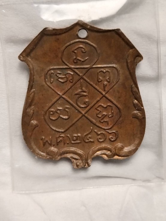 เก้าทัพ ......... หลวงพ่อแจ่ม พระครูธรรมเสนาณี วัดโชค อ.โพธาราม จ.ราชบุรี รุ่นแรก ปี 2466 .............เก้าทัพ"เหรียญนี้เจาะปั๊ม(แอ่น)นะครับเหรียญจะงอคล้ายโล่เกาะ |