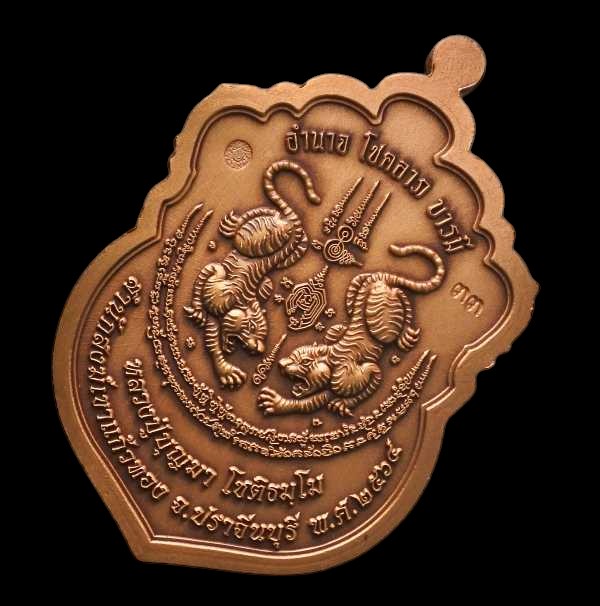 เหรียญเสมาเสือคาบดาบ 1 พยัคฆ์บุญมา มหาบารมี หลวงปู่บุญมา สำนักสงฆ์เขาแก้วทอง เนื้อทองแดงซาติน ลงยาขอบน้ำเงิน บนน้ำเงิน+จีวร (หลังเสือคู่) หมายเลข 33 |