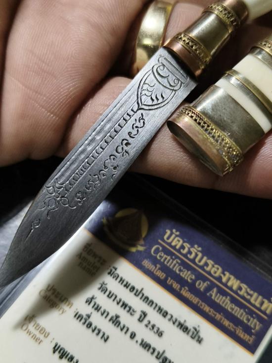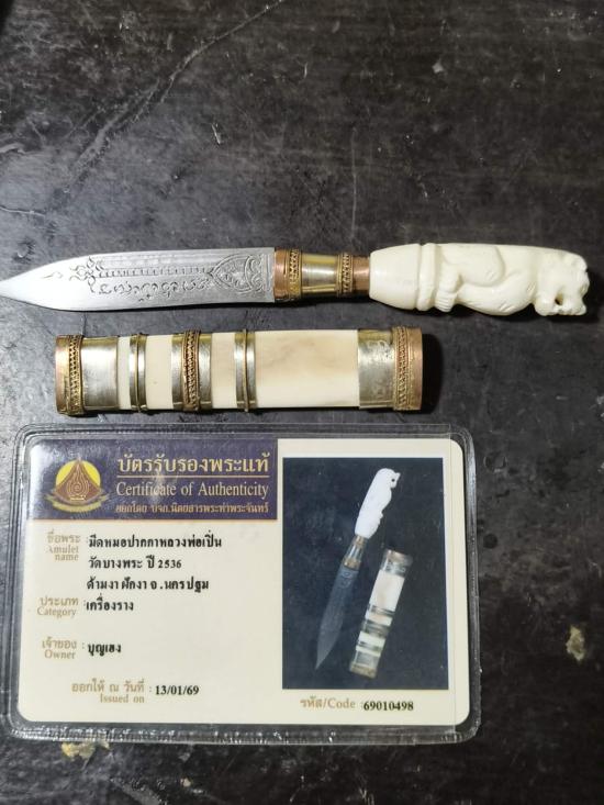 มีดหมอหัวเสือ ด้ามงา-ฝักงา หลวงพ่อเปิ่น วัดบางพระ ปี2536 พร้อมบัครรับรอง |
