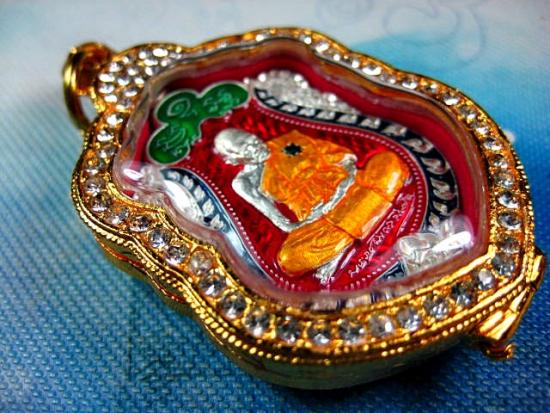 เหรียญเสมาที่ระลึกอายุครบ 9 รอบ เนื้อชุบเงินลงยาผังพลอยเขียว ใส่กรอบอิตาลี่ มีกล่องเดิม หลวงปู่อิ่ม วัดทุ่งนาใหม่ (---A18---) |