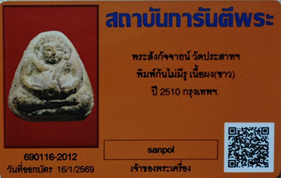 พระพิมพ์สังกัจายน์(เนื้อขาว) วัดประสาท กรุงเทพฯ องค์พระมีขนาด จัดสร้างเมื่อปีตั้งแต่2506-2510 โดยพระครูสมุหอำพล (เจ้าอาวาสวัดประสาทในขณะนั้น) ซึ่งมวลสารประกอบด้วยผงพระที่แตกหักจากกรุบางขุนพรหม(ปี2500)ล้วนๆ .........องค์พระเนื้อแห้ง สวยเนื้ดจัด แกร่งเป็นธรรมชาติ ครับ แท้ๆการันตีโดย "g-pra"ครับ