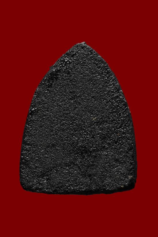 ลักษณะพิมพ์ เนื้อผงคลุกรักรูปร่าง 3 เหลี่ยม ด้านเป็นรูปพระพุทธปางสมาธิ