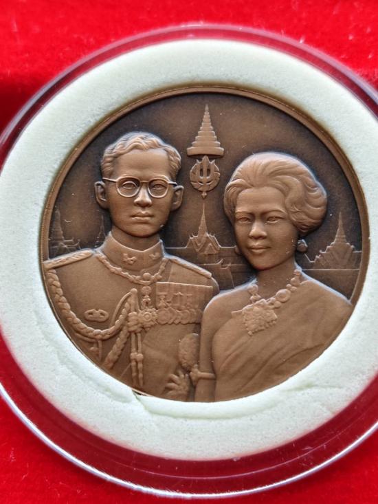 เหรียญที่ระลึกเนื่องในโอกาสครบ 50 ปี ราชาภิเษกสมรส 28 เมษายน 2543 เนื้อทองแดงรมดำพ่นทรายพิเศษ |