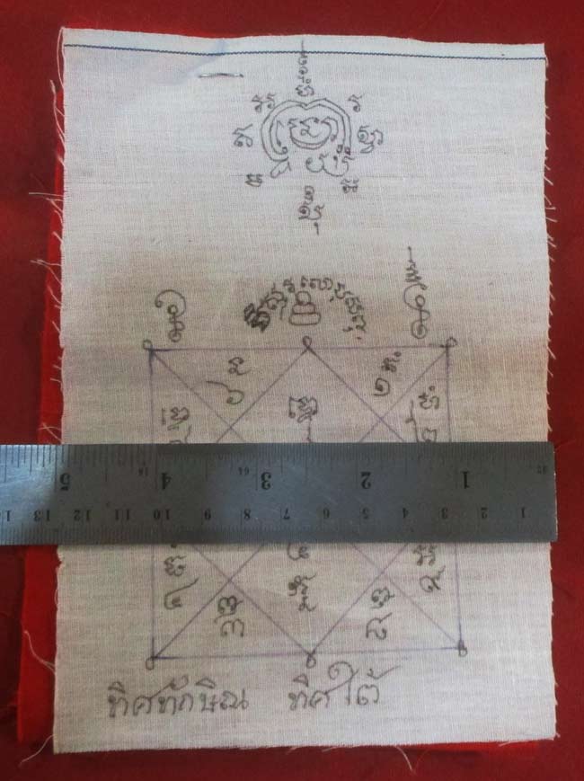 ผ้ายันต์ ไม่ทราบที่ จารยันต์ด้วยมือ ที่ผ้ายันต์เขียน "ทิศทักษิณ ทิศใต้" ครับ (พระบ้าน ครับ) |