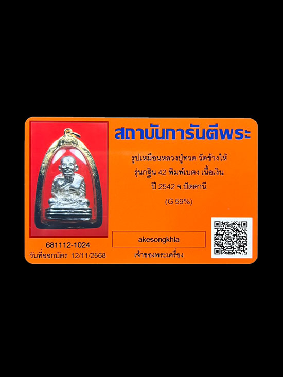 หลวงปู่ทวด วัดช้างให้ รุ่นกฐิน 42 พิมพ์เบตงเลขใต้ฐาน เนื้อเงิน ปี 2542 จ.ปัตตานี พร้อมเลี่ยมกรอบทองคำ