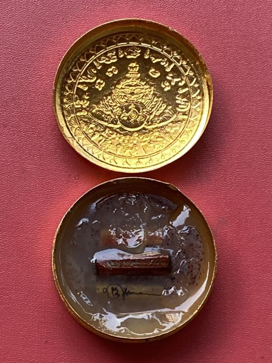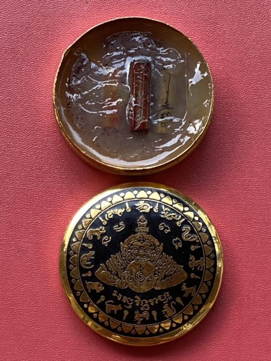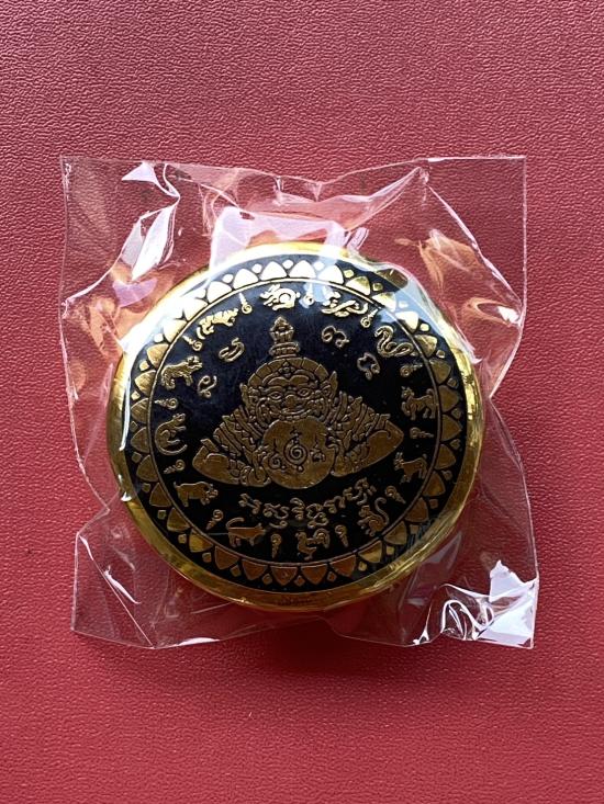 เคาะเดียวแดง สีผึ้งพระราหู รุ่น มงคลจักรวาล เนื้อ โลหะชุบทองลงยาสีดำขอบสีดำ ขนาด5ซม |