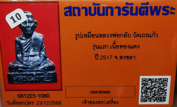 รูปเหมือนหลวงพ่อกลับ วัดเถรแก้ว รุ่นแรก เนื้อทองแดง ปี2517 จ.สงขลา + บัตรG-pra สภาพเดิมค่ะ สภาพตามรุปทุกประการค่ะ