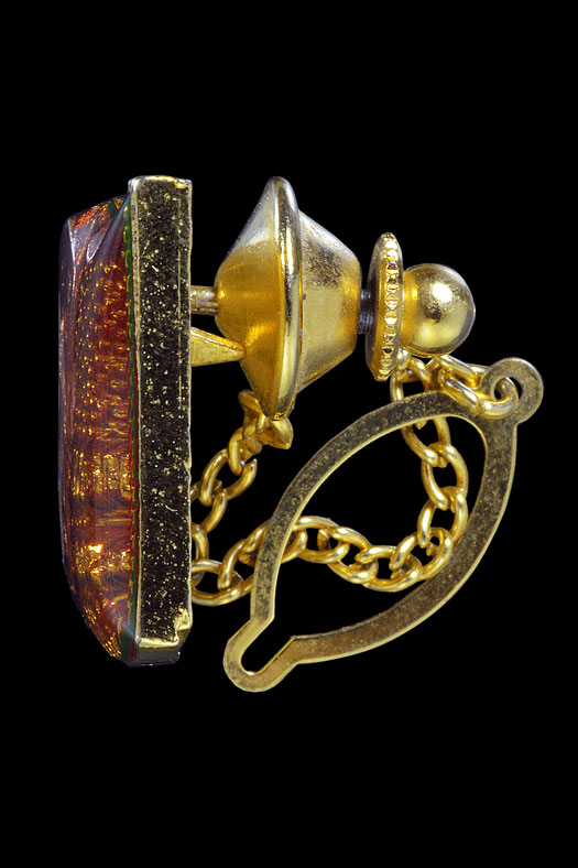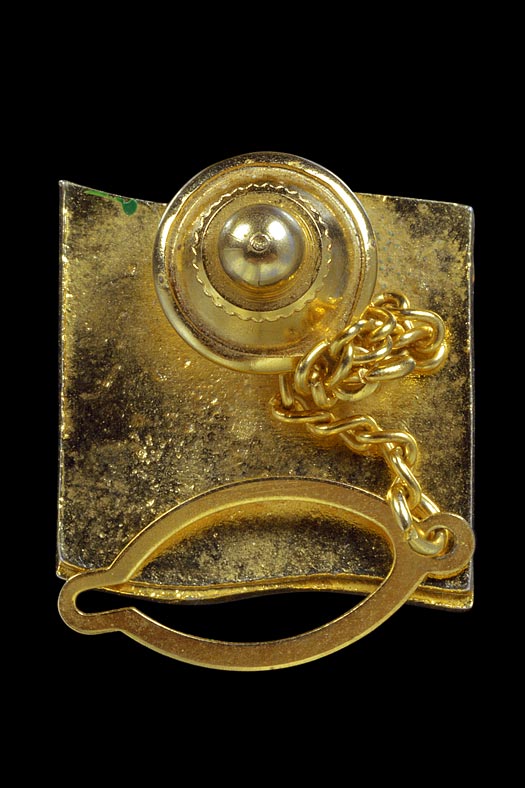 เข็มกลัดติดเนคไท , ติดปรกเสื้อ ( ใบมะขามรูปเหมือนนั่งยอง , เนื้อโลหะกะไหล่ทอง , เคลือบเรซิ่นลงยา ) พ.ศ.2539