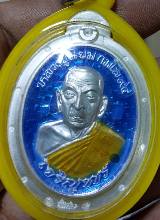 เหรียญเจริญพรเมตตามหานิยม หลวงปู่นิยม กมโล เนื้อเงินลงยาน้ำเงินไม่ตัดปีก หลังแบบ ๙รอบ กรรมการ no ๓ ควัดแจ้งนอก ปี 2555 |