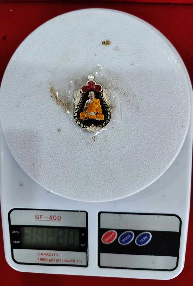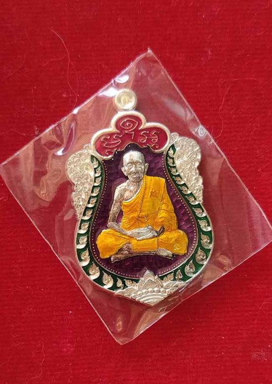 เหรีญเสมาแสนปาฏิหาริย์ หลวงปู่แสน วัดบ้านหนองจิก อำเภอขุนหาญ จังหวัดศรีสะเกษ เนื้อเงิน ลงยาราชาวดี 4 สี no.19 ปี 2561 กล่องดิม