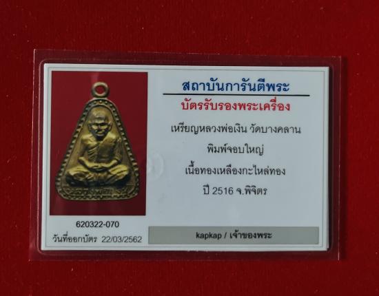เหรียญปั้มหลวงพ่อเงิน พิมพ์จอบใหญ่ วัดบางคลาน ปี พ.ศ. 2516 พร้อมบัตรการันตรีพระ |