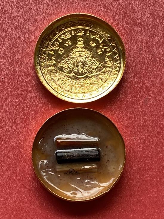 เคาะเดียวแดง สีผึ้งพระราหู รุ่น มงคลจักรวาล เนื้อ โลหะชุบทองลงยาสีดำขอบสีดำ ขนาด5ซม |