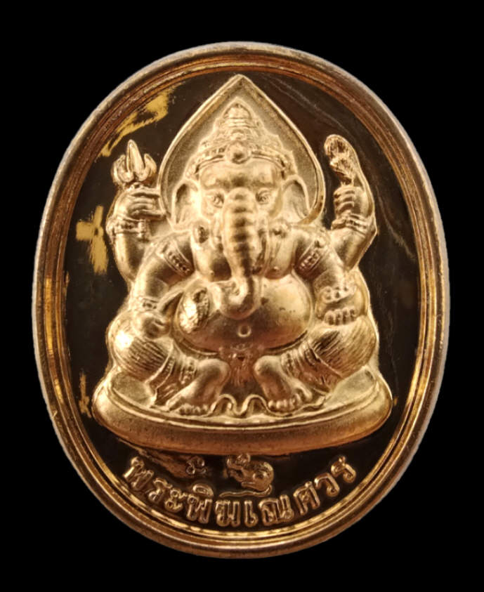 เหรียญหล่อสองมหาเทพ ท้าวมหาพรหม พระพิฆเนศวร หลวงปู่หงษ์ พรหมปัญโญ วัดเพชรบุรี สุรินทร์ รุ่นโชคดีมีสุข ตอก2โค้ด เนื้อทองเหลืองกะไหล่ทอง ปี2547 กล่องเดิม