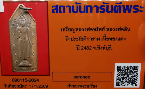 เหรียญหลวงพ่อทรัพย์ วัดประโชติการาม พิมพ์หลังหลวงพ่อสิน เนื้อทองแดง ห่วงเดิม ปี2482 จ.สิงห์บุรี + บัตรG-pra สภาพเดิมค่ะ สภาพตามรูปทุกประการค่ะ