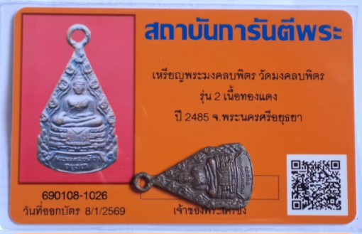 เหรียญหลวงพ่อมงคลบพิตร รุ่น 2 ปี 2485 จ.อยุธยา พร้อมบัตรรับรอง |