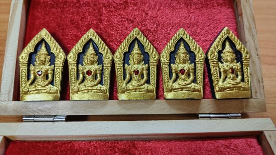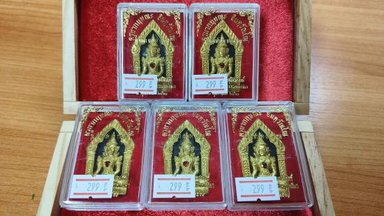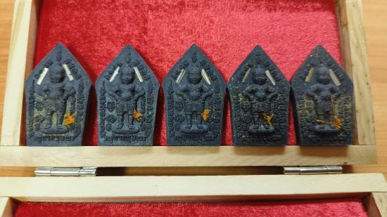 แบ่งปัน พระผงขุนแผน รุ่นเจ้าสัวเฮงเฮงรวยรวย ครูบากฤษณะ อินทฺวัณโณ ปี 2561 เนื้อดำองค์ทองซุ้มทอง ฝังพลอยแดง ตะกรุดเงินคู่ ด้านหลังฝังจีวรผงตะไบ ชุด 5 องค์ ประกันแท้