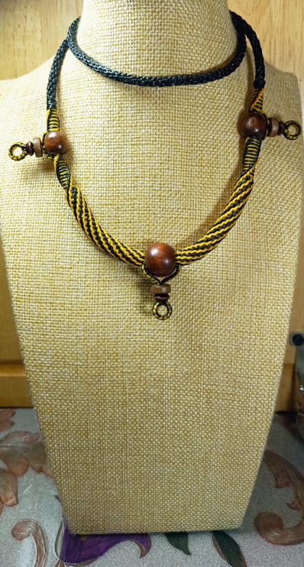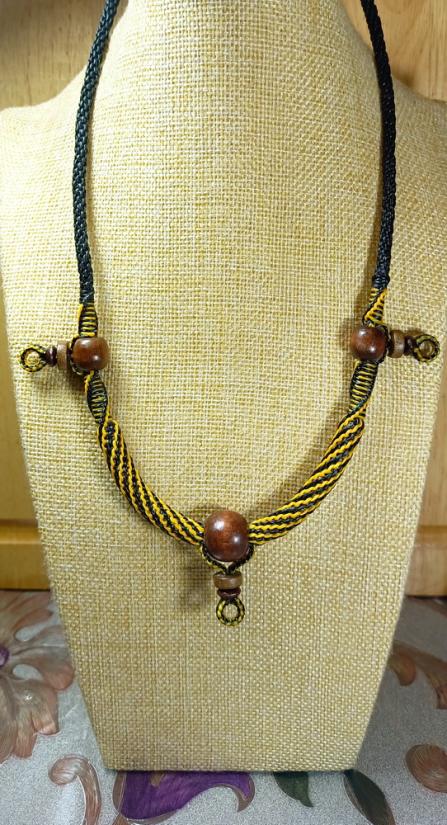 สร้อยคอเชือกเทียน งานถักมือ ( สีดำ-เหลืองทอง + แซมลูกปัดไม้ธรรมชาติ ห้อยพระ 3 องค์ )