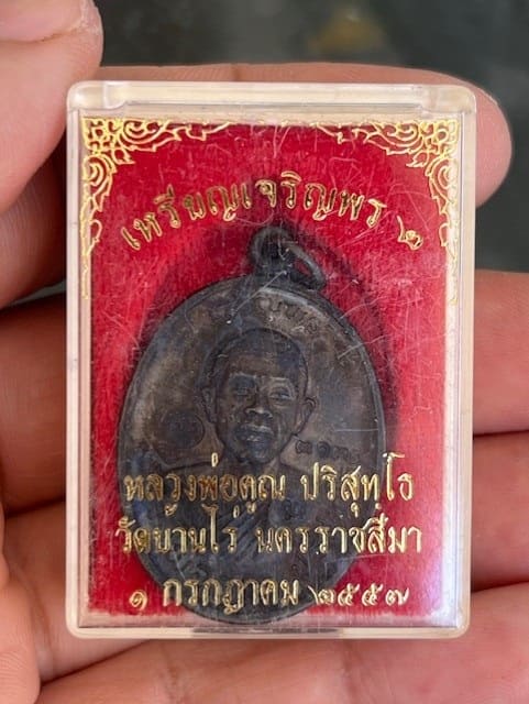 หลวงพ่อคูณ เหรียญเจริญพรบน 2 พรหมเทพ เนื้อทองแดงรมดำ เลข No.3134 จมูกโด่ง ผิวรุ้ง พร้อมกล่องเดิม |