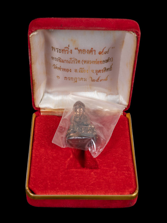 พระกริ่ง " ทองดำ ๙๙ " หลวงพ่อทองดำ วัดท่าทอง จ.อุรดิตถ์ พ.ศ. 2538 เนื้อนวะโลหะ ก้นเงิน ตอก 4 โค๊ต ตอกเลข สภาพสวยกล่องเดิม !!