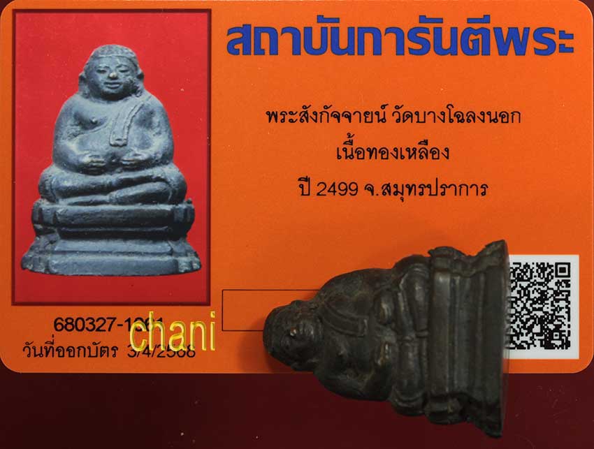 พระสังกัจจายน์ วัดบางโฉลง เนื้อทองเหลือง ปี2499 จ.สมุทรปราการ สภาพสวยเก่าตามอายุหายาก อุดกริ่ง เสียงดังไม่ขัด พร้อมบัตรรับรองพระแท้จากจีพระอุ่นใจได้ ไม่ต้องลุ้นค่ะ |