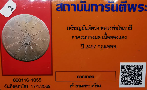 เหรียญยันต์ดวง หลวงพ่อโอภาสี อาศรมบางมด เนื้อทองแดง ตอกโค๊ต ปี2497 จ.กรุงเทพฯ + บัตรG-pra สภาพเดิมค่ะ สภาพตามรูปทุกประการค่ะ