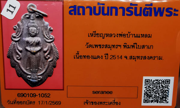เหรียญหลวงพ่อวัดบ้านแหลม วัดเพชรสมุทรฯ เนื้อทองแดง ห่วงเดิม ปี2514 จ.สมุทรสงคราม + บัตร G-pra สภาพสวยเดิมค่ะ