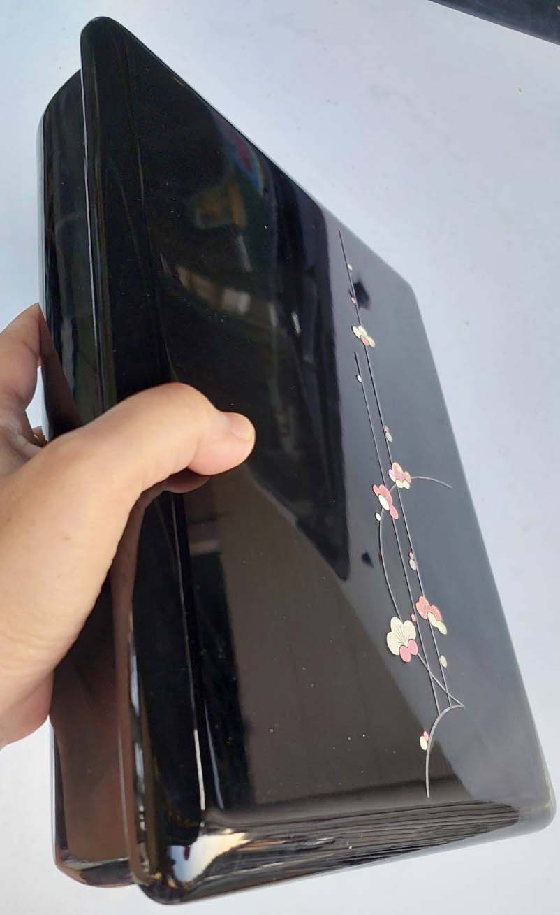 ***วัดใจ***กล่องไม้วินเทจญี่ปุ่น งานไม้ญี่ปุ่นเคลือบเงาแบบ Wajima-nuri พื้นดำลวดลายสวยงาม ตกแต่งลวดลายด้วยเปลือกหอยเป๋าฮื้อวิบวับทรงสี่เหลี่ยมผืนผ้า ขนาด 9.5 x 12 หนา 2.5 นิ้ว