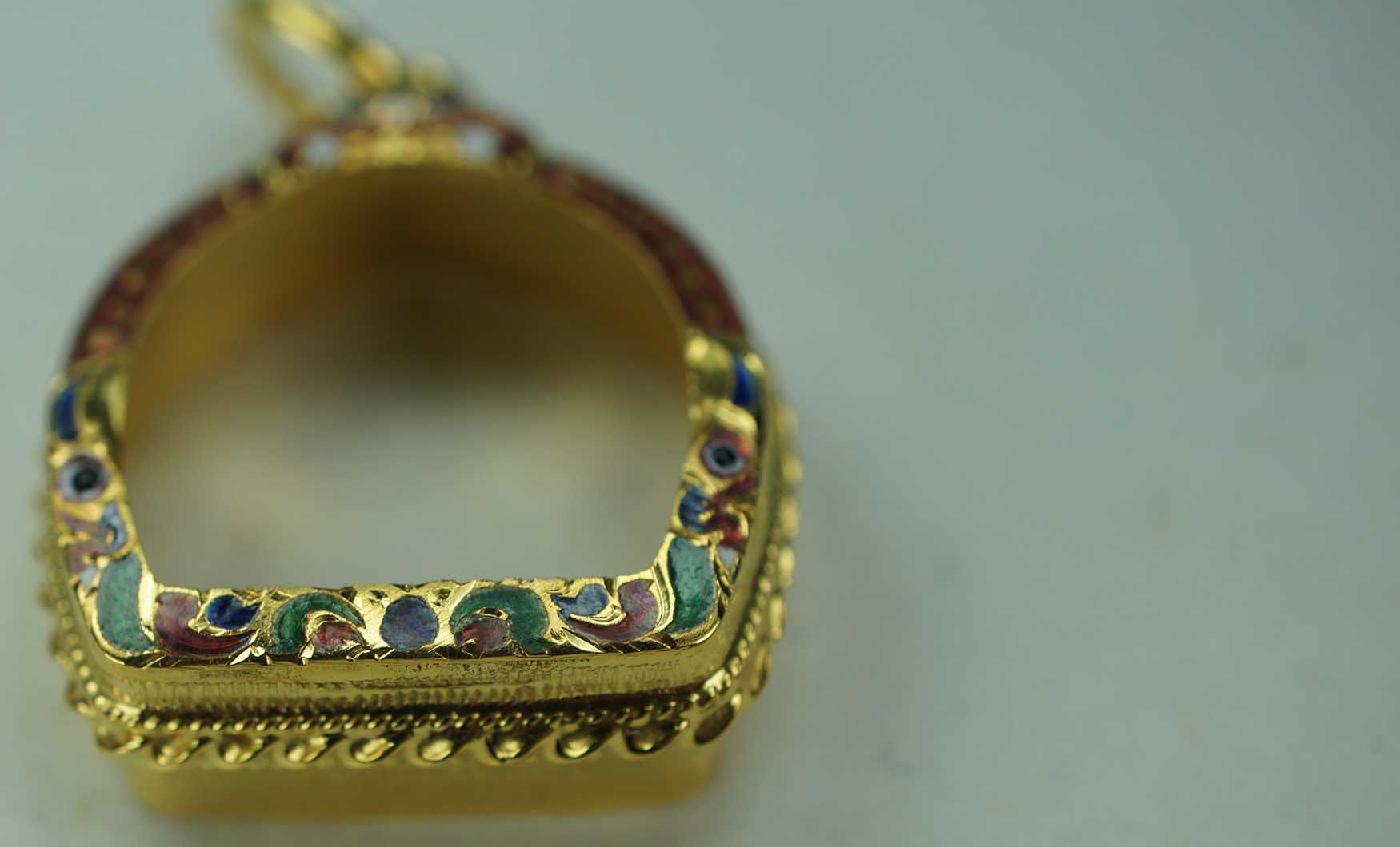 กรอบทอง ลงยาล้อม ยกซุ้ม หัวสิงห์ ข้างเกลียวโปเต้ 3 เส้น แกะลายทั้งใบ ใส่พระปิดตาปุ้มปุ้ย *** หลวงปู่ทิม วัดละหารไร่ ***หรือขนาดไกล้เคียง ขนาดกว้างจากขอบใน *** สูง 1.4 กว้างจากฐาน 1 ซม. *** งานขึ้นมือ