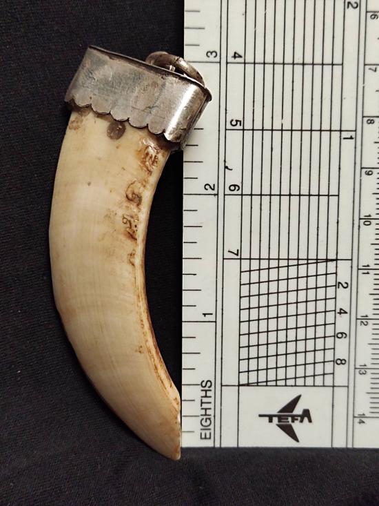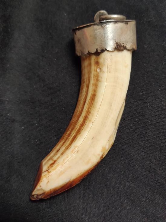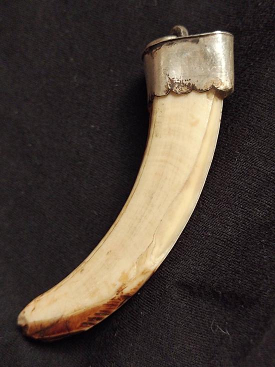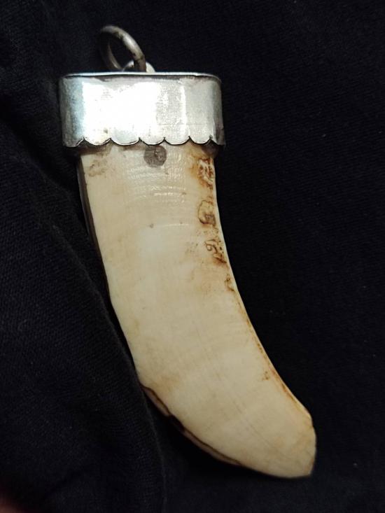 เขี้ยวหมูตันยาวประมาณ 3 นิ้ว หุ้มปลอกเงินพร้อมใช้ ไม่ทราบที่