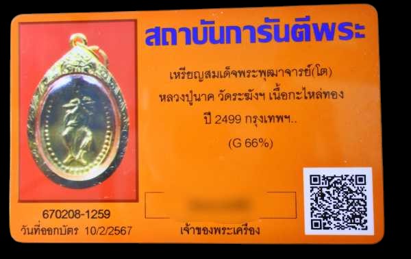 เหรียญสมเด็จพระพุฒาจารย์(โต) หลวงปู่นาค วัดระฆังฯ เนื้อกะไหล่ทอง ปี 2499 กรุงเทพฯ.พร้อมบัตรรับรอง