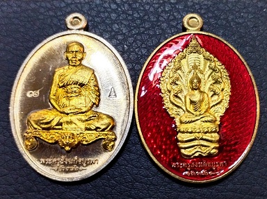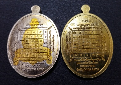 เหรียญหลวงปู่บัว รุ่นมงคลมหาลาภ เหรียญนั่่งโต๊ะเต็มองค์เนื้ออัลปาก้า องค์ทองทิพย์ + เหรียญพระนากปรกเนื้อทองระฆังลงยาแดง รวม 2 เหรียญ ปี 2559
