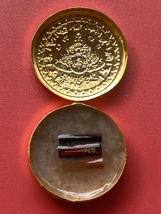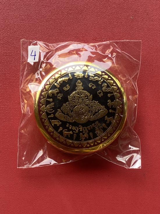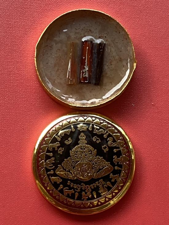 เคาะเดียวแดง สีผึ้งพระราหู รุ่น มงคลจักรวาล เนื้อ โลหะชุบทองลงยาสีดำขอบสีแดง ขนาด5ซม |