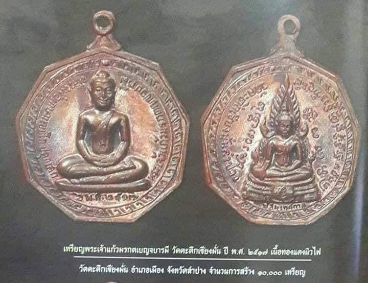 สวยมากๆครับ มีห่วงเดิม เหรียญพระเจ้าแก้วมรกตเบญจบารมี วัดคะตึกเชียงมั่น หลวงพ่อเกษม เขมโก เมตตาอธิษฐานจิตปลุกเสกเมื่อวันที่ ๖ พฤษภาคม ๒๕๑๗ เนื้อทองแดง รูปแบบเหรียญทรงแปดเหลี่ยมสวยงามมาก ด้านหน้าเป็นพระเจ้าแก้วมรกต ด้านหลังเป็นพระพุทธชินราช พระดี พิธีใหญ่ มีประสบการณ์ ปีลึก
