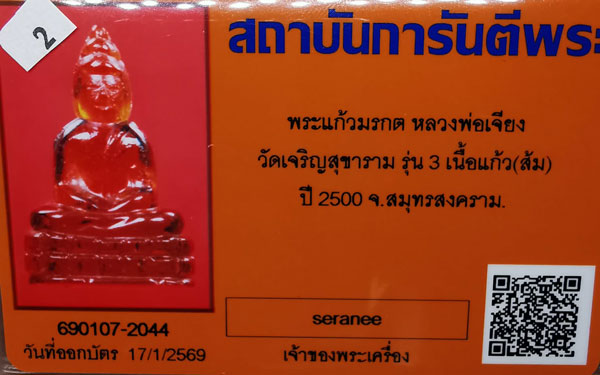 พระแก้วมรกต หลวงพ่อเจียง วัดเจริญสุขาราม รุ่น3 เนื้อแก้ว(ส้ม) ปี2500 จ.สมุทรสงคราม + บัตรG-pra สภาพเดิมค่ะ สภาพตามรูปทุกประการค่ะ