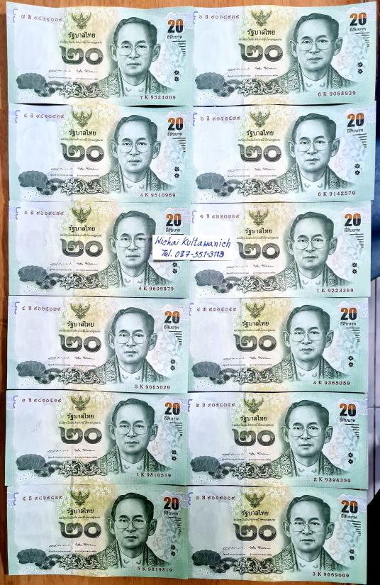 ธนบัตร ร 9 ชนิดราคา 20 บาท แบบ 16.5 ผ่านใช้ สภาพสวยๆ เลข 9หน้า-9หลัง ทุกใบ จำนวน 12 ใบ |