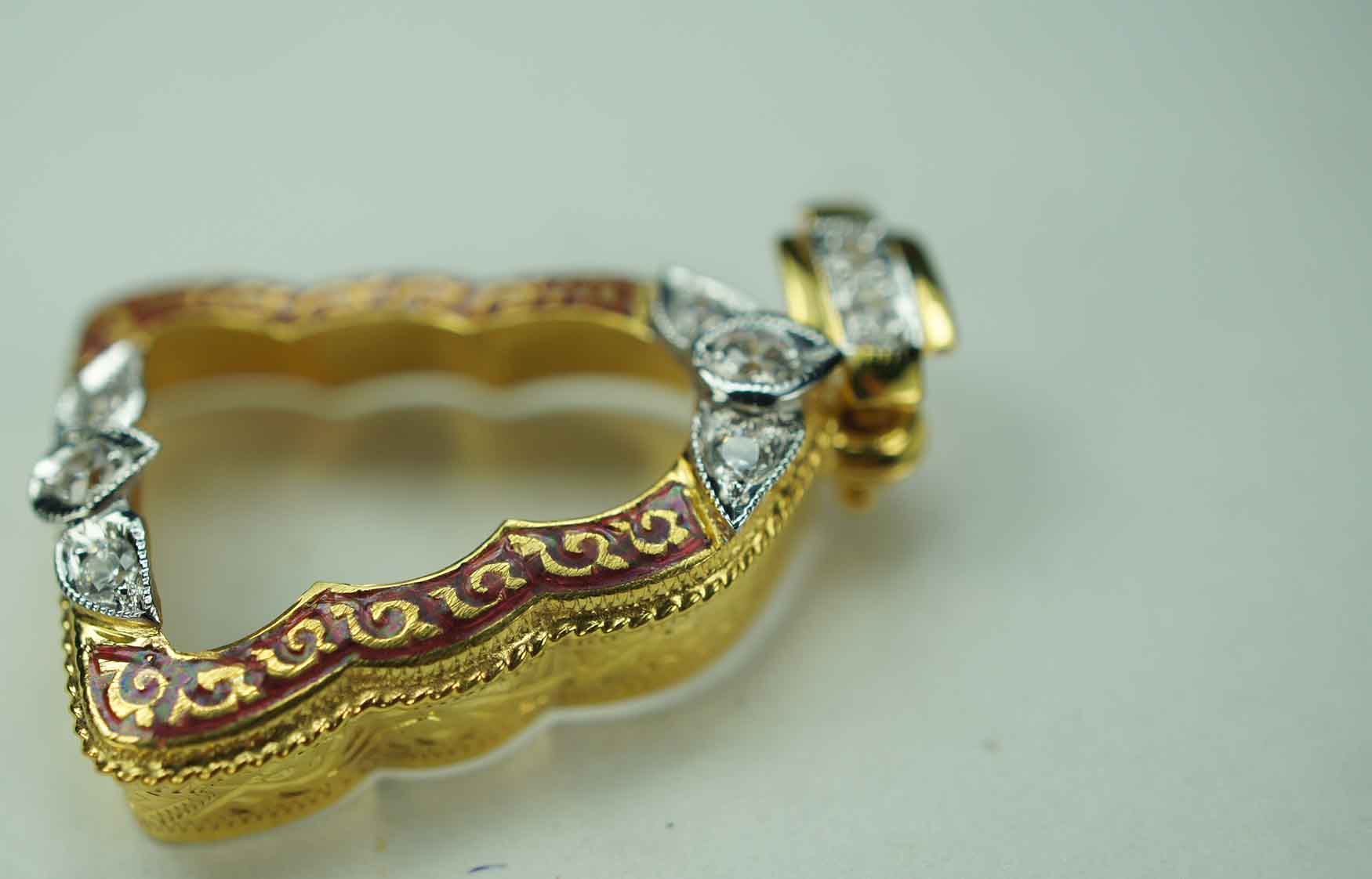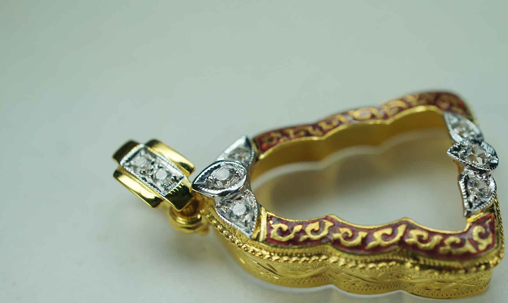 กรอบทองคำ ใส่พระปิดตาข้าวตอกแตก หลวงปู่ทิม ลงยาสีแดง ห่วงเพชร ฝังเพชร CZ 8 เม็ด ข้างเกลียวโปเต้ งานขึ้นมือ น้ำหนัก 2.65 กรัม เปอร์เซ็นต์ทอง 65-70 เปอร์เซ็นต์ รับประกันตามกฏการันตีพระทุกข้อกำหนด ยินดีจ
