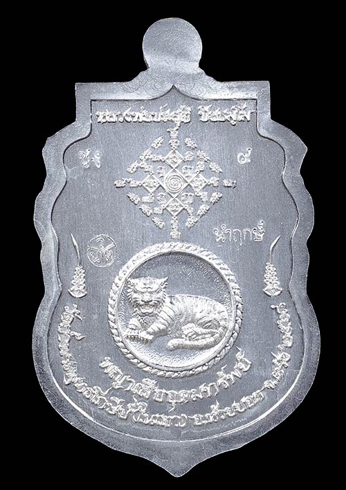 1 ใน 10 เหรียญเสมาพญาเสืออุดมทรัพย์ พระอาจารย์ประสูติ (หลวงพ่อประสูติ) วัดในเตา จ.ตรัง เนื้อชุบเงินลงยาม่วงลงยาขอบบน-ล่าง นำฤกษ์ เพ้นท์ขอบพญานาคจีวรทองฝังพลอย เลขสวยNO.9(ที่สุดของเลขมงคล)