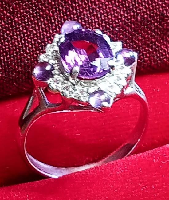 แหวนเงินแท้เคลือบทองคำขาว หัวอะเมทิสล้อมเพชรรัสเซีย งานหรูหรามาก พลอยเกรดดีมากน้ำใสกิ๊ก ไซซฺ์ประมาณ 56-57 น่ำหนักประมาณ 3.47 กรัม (เกือบสลึง) งานมือหนึ่งไม่ผ่านการใช้ครับ งดงามแข็งแรงทนทาน สภาพสวยกริบตามรูป ส่งฟรีทั่วไทย รับประกันตามกฎครับ