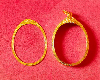 รายละเอียด กรอบทองใหม่ ไม่เคยใช้ สำหรับใส่เหรียญเจริญพร ลพ.คูณ หรือเหรียญคณาจารย์ทั่วไป น้ำหนัก 3.84 กรัม ขนาด กว้าง 2.6 x 3.3 ซ.ม. ขอบหนา 0.50 ซ.ม.