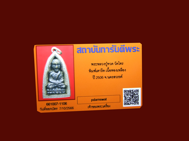 หลวงปู่ทวด วัดไทร พิมพ์เตารีดใหญ่ เนื้อทองเหลืองรมดำ ปี 2506 + บัตรรับรอง 2 สถาบัน พระผิวเดิม จับกรอบเก่าโบราณ วินเทจเดิม รับประกันตามกฎ G-pra ครับ