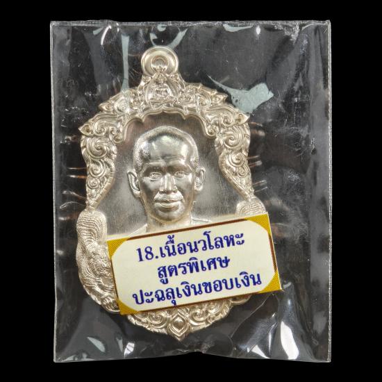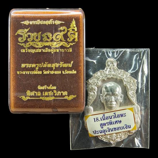 เหรียญเสือคู่มหาบารมี รวยนะ ๙ ดี พระอาจารย์ต้อม วัดท่าสะแบง ร้อยเอ็ด เนื้อนวโลหะสูตรพิเศษ ปะฉลุเงินขอบเงิน (เหรียญประกบเนื้อเงิน + เนื้อนวโลหะ) หมายเลข ๔๘๕ พร้อมกล่องเดิม ถวายงาน โดย ป๋าต้อย เมืองนนท์