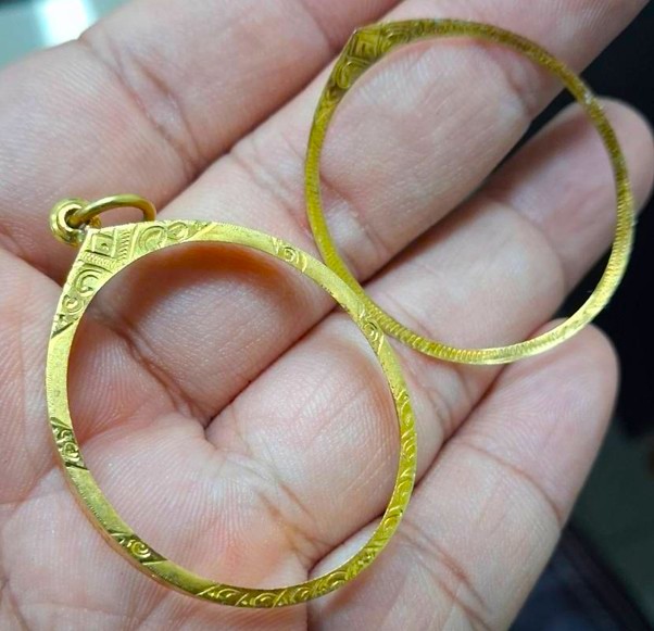 กรอบทองมือสอง ใส่เหรียญอาจาร์ฝั้น รุ่น9 หรือรูปไข่ยอดนิยมทั่วไปที่ไกล้เคียง หน้าจอกว้าง 2.80 ซม., สูง 3.20 ซม. น้ำหนัก 2.55 กรัม เคาะเดียว