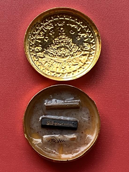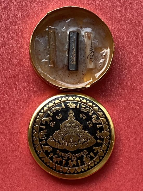 เคาะเดียวแดง สีผึ้งพระราหู รุ่น มงคลจักรวาล เนื้อ โลหะชุบทองลงยาสีดำขอบสีดำ ขนาด5ซม |