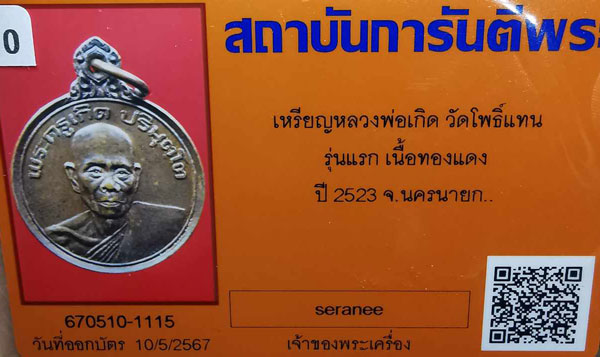 เหรียญหลวงพ่อเกิด วัดโพธิ์แทน รุ่นแรก เนื้อทองแดง ห่วงเดิม ปี2523 จ.นครนายก + บัตรG-pra สภาพเดิมค่ะ
