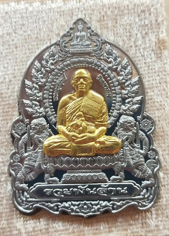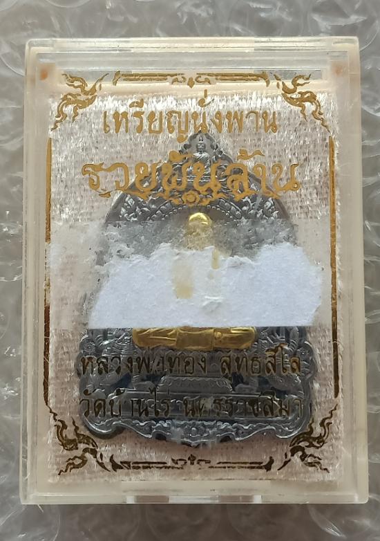 เหรียญนั่งพาน รวยพันล้าน หลวงพ่อทอง วัดบ้านไร่ เนื้อตะกั่วหน้ากากทองทิพย์ หลังเรียบตอก 9 รอบ ฝังตะกรุด โค้ตนำฤกษ์ |
