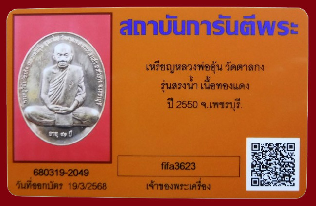แดงที่เคาะแรก !!! เหรียญรุ่นสรงน้ำ พิมพ์ใหญ่ หลวงพ่ออุ้น วัดตาลกง ปี2550 + บัตรพระแท้ |