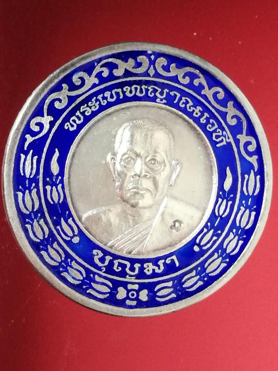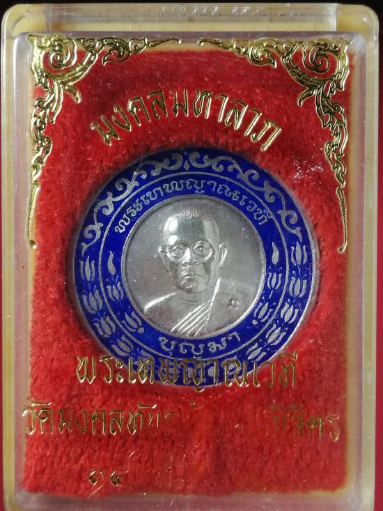 เหรียญมงคลมหาลาภ เนื้อเงินลงยา พระเทพญาณเวที(พ่อบุญมา) วัดมงคลทับคล้อ พิจิตร ปี ๒๕๓๘ น้ำหนักเงิน 15.5 กรัม พร้อมกล่อง